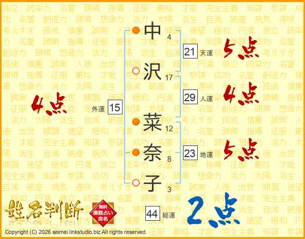 中沢菜奈子さんの総運は44画の2点