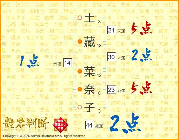 土(3画)藏(18画) 菜(12画)奈(8画)子(3画)