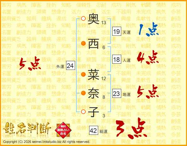 奥(13画)西(6画) 菜(12画)奈(8画)子(3画)