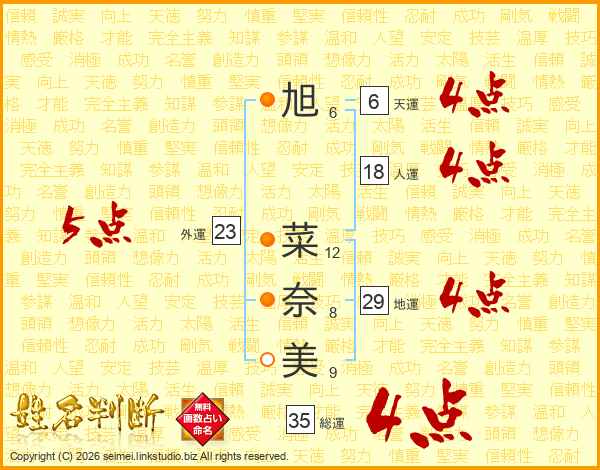 旭(6画) 菜(12画)奈(8画)美(9画)