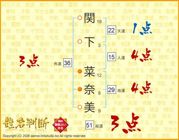 関下菜奈美さんの人運は15画の4点!