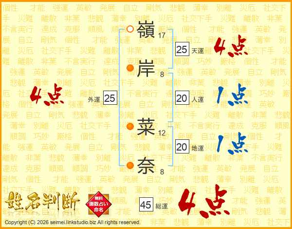嶺(17画)岸(8画) 菜(12画)奈(8画)