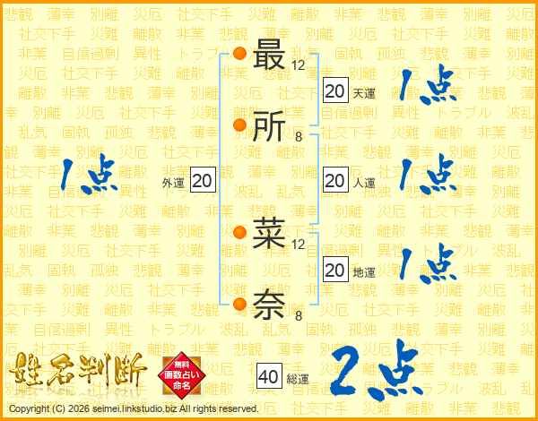 生活面を象徴する運勢です。外部から受ける影響力を表し、結婚運、家庭運や職場、環境への順応性を表します。総運から人運を引いた画数。姓や名が1文字の場合を除く。