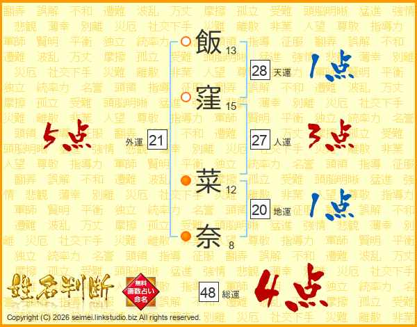 飯(13画)窪(15画) 菜(12画)奈(8画)