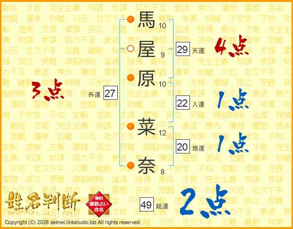 馬屋原菜奈さんの総運は49画の2点!