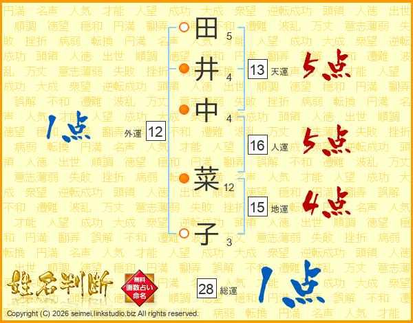 田(5画)井(4画)中(4画) 菜(12画)子(3画)
