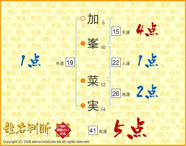 生活面を象徴する運勢です。外部から受ける影響力を表し、結婚運、家庭運や職場、環境への順応性を表します。総運から人運を引いた画数。姓や名が1文字の場合を除く。