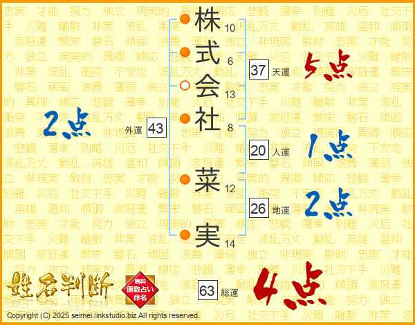 株(10画)式(6画)会(13画)社(8画) 菜(12画)実(14画)