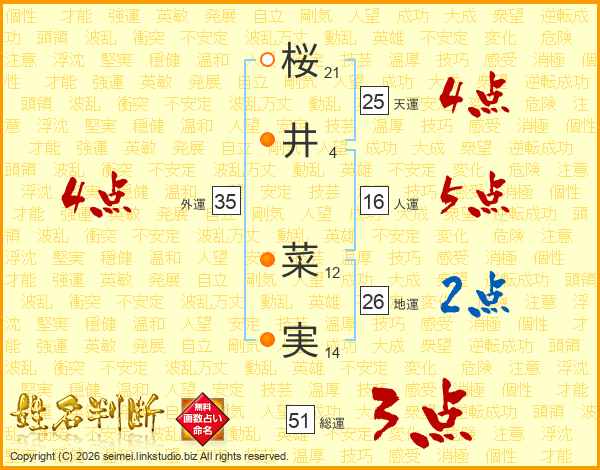 生活面を象徴する運勢です。外部から受ける影響力を表し、結婚運、家庭運や職場、環境への順応性を表します。総運から人運を引いた画数。姓や名が1文字の場合を除く。