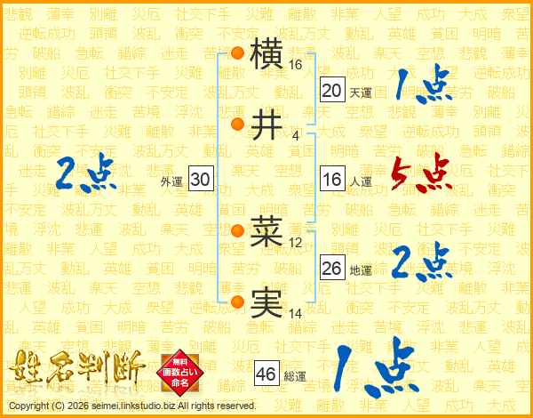 生活面を象徴する運勢です。外部から受ける影響力を表し、結婚運、家庭運や職場、環境への順応性を表します。総運から人運を引いた画数。姓や名が1文字の場合を除く。