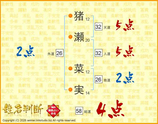猪(12画)瀬(20画) 菜(12画)実(14画)