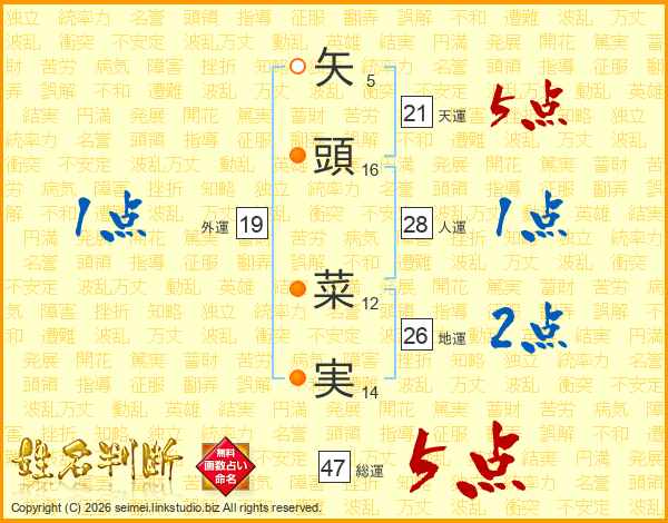 矢(5画)頭(16画) 菜(12画)実(14画)