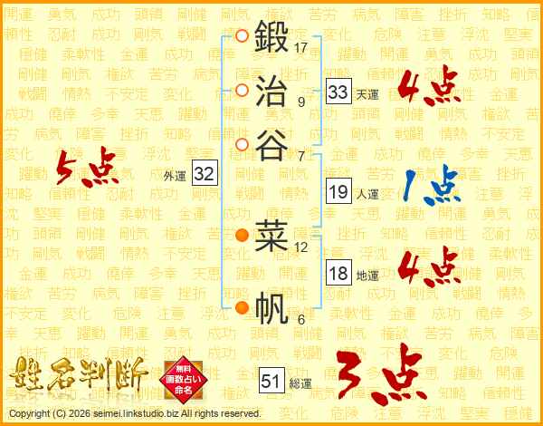 鍛(17画)治(9画)谷(7画) 菜(12画)帆(6画)