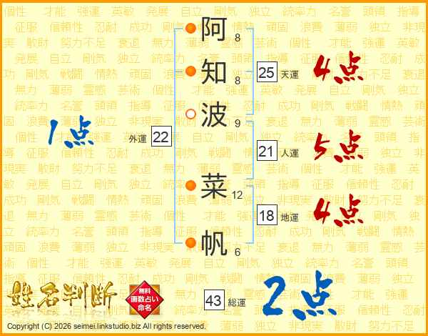 阿(8画)知(8画)波(9画) 菜(12画)帆(6画)