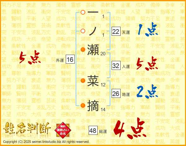 一(1画)ノ(1画)瀬(20画) 菜(12画)摘(14画)