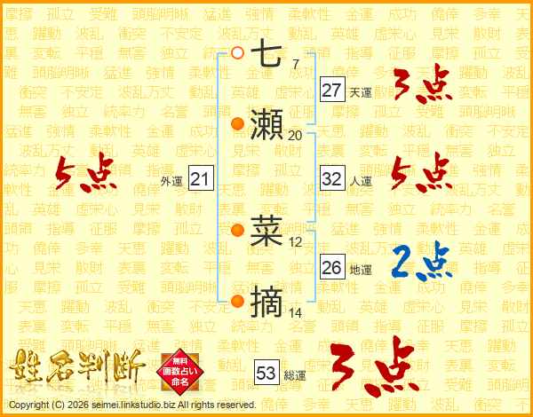 七瀬菜摘さんの総運は53画の3点!