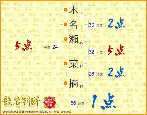 木(4画)名(6画)瀬(20画) 菜(12画)摘(14画)