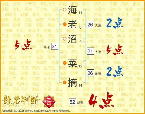生活面を象徴する運勢です。外部から受ける影響力を表し、結婚運、家庭運や職場、環境への順応性を表します。総運から人運を引いた画数。姓や名が1文字の場合を除く。
