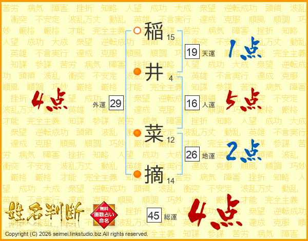 稲(15画)井(4画) 菜(12画)摘(14画)