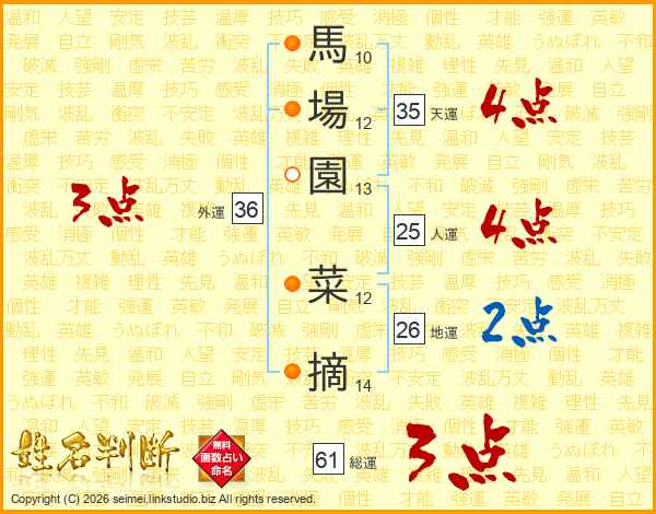生活面を象徴する運勢です。外部から受ける影響力を表し、結婚運、家庭運や職場、環境への順応性を表します。総運から人運を引いた画数。姓や名が1文字の場合を除く。