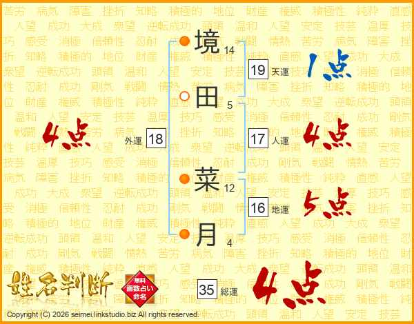 境(14画)田(5画) 菜(12画)月(4画)