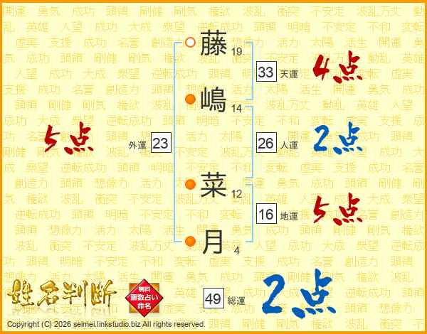 藤(19画)嶋(14画) 菜(12画)月(4画)