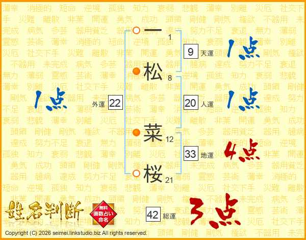 生活面を象徴する運勢です。外部から受ける影響力を表し、結婚運、家庭運や職場、環境への順応性を表します。総運から人運を引いた画数。姓や名が1文字の場合を除く。