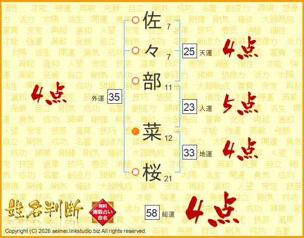 佐(7画)々(7画)部(11画) 菜(12画)桜(21画)
