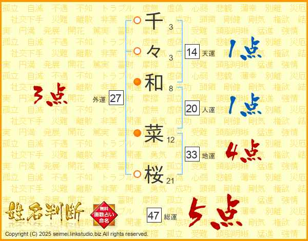 千(3画)々(3画)和(8画) 菜(12画)桜(21画)