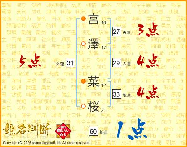 宮(10画)澤(17画) 菜(12画)桜(21画)