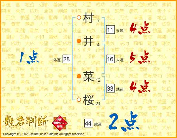 村井菜桜さんの総運は44画の2点!