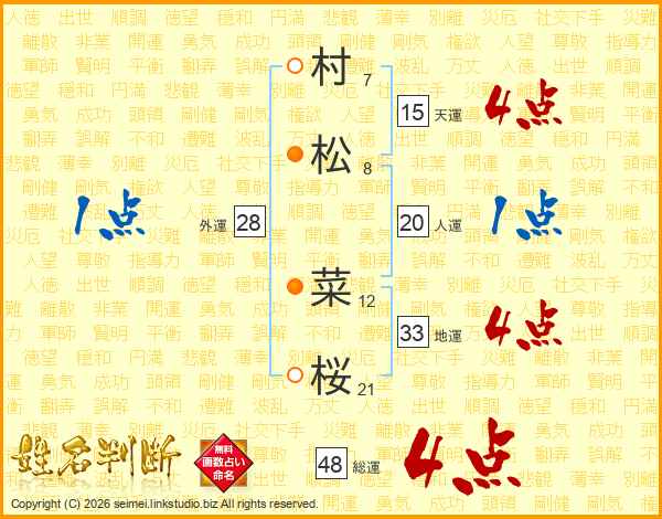 生活面を象徴する運勢です。外部から受ける影響力を表し、結婚運、家庭運や職場、環境への順応性を表します。総運から人運を引いた画数。姓や名が1文字の場合を除く。