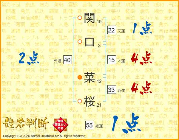 関口菜桜さんの天運は22画の1点!