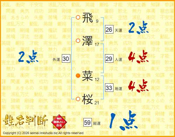 飛(9画)澤(17画) 菜(12画)桜(21画)
