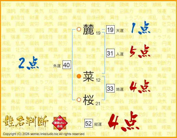 麓菜桜さんの総運は52画の4点!