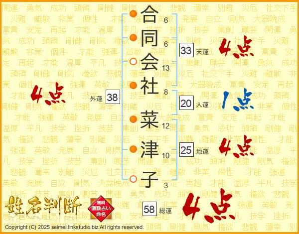 合(6画)同(6画)会(13画)社(8画) 菜(12画)津(10画)子(3画)