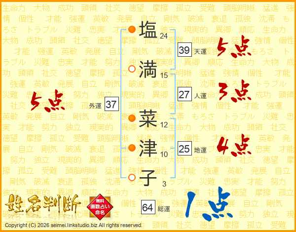 塩(24画)満(15画) 菜(12画)津(10画)子(3画)