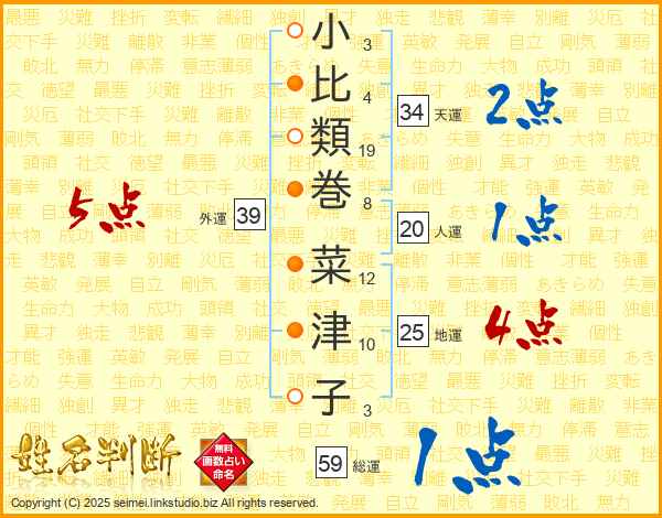 小(3画)比(4画)類(19画)巻(8画) 菜(12画)津(10画)子(3画)