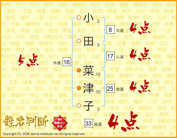 小(3画)田(5画) 菜(12画)津(10画)子(3画)