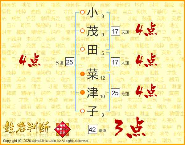 小(3画)茂(9画)田(5画) 菜(12画)津(10画)子(3画)