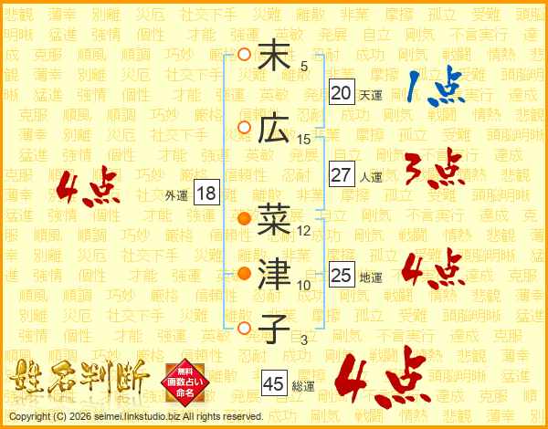末(5画)広(15画) 菜(12画)津(10画)子(3画)