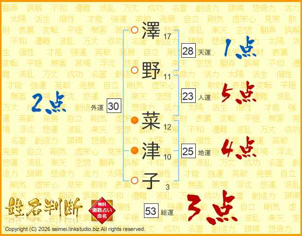 澤(17画)野(11画) 菜(12画)津(10画)子(3画)