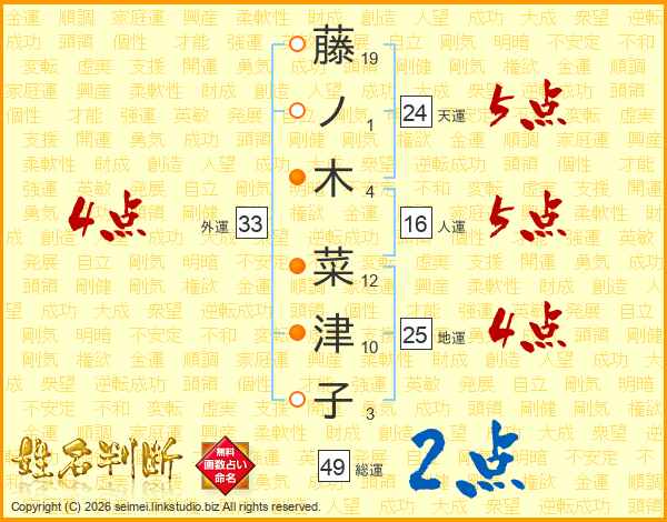 藤(19画)ノ(1画)木(4画) 菜(12画)津(10画)子(3画)