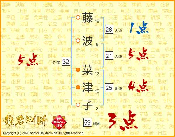 藤(19画)波(9画) 菜(12画)津(10画)子(3画)