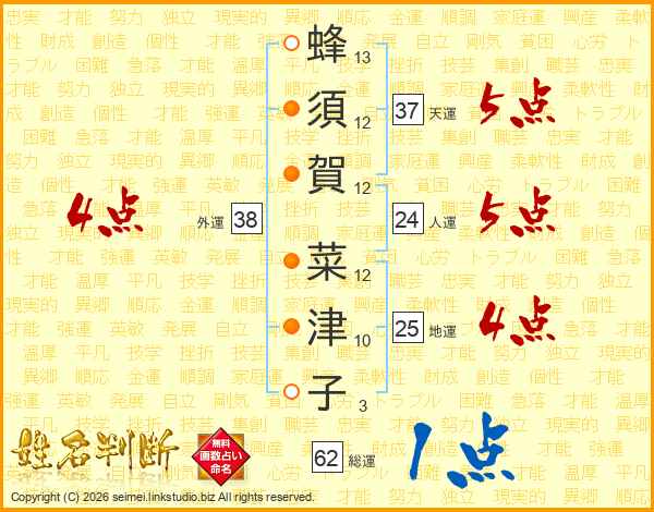 蜂(13画)須(12画)賀(12画) 菜(12画)津(10画)子(3画)