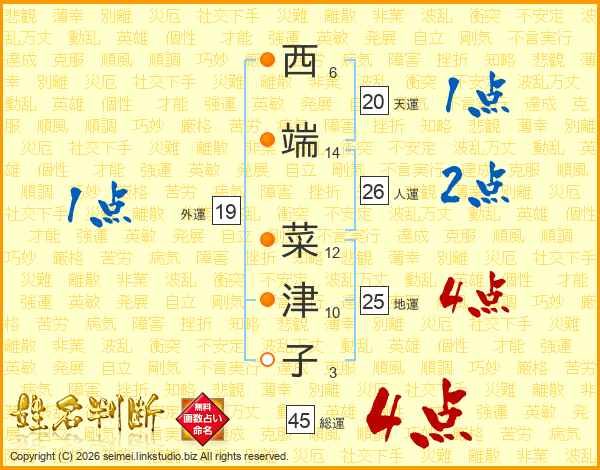 生活面を象徴する運勢です。外部から受ける影響力を表し、結婚運、家庭運や職場、環境への順応性を表します。総運から人運を引いた画数。姓や名が1文字の場合を除く。