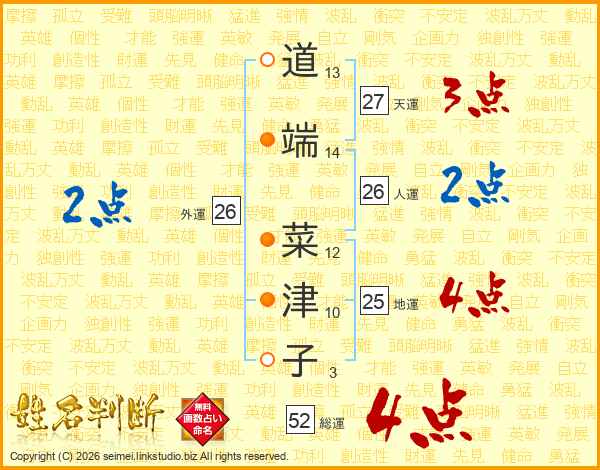 道(13画)端(14画) 菜(12画)津(10画)子(3画)
