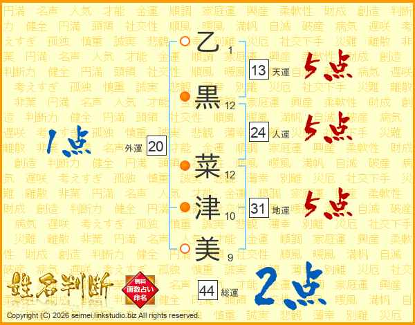 乙(1画)黒(12画) 菜(12画)津(10画)美(9画)