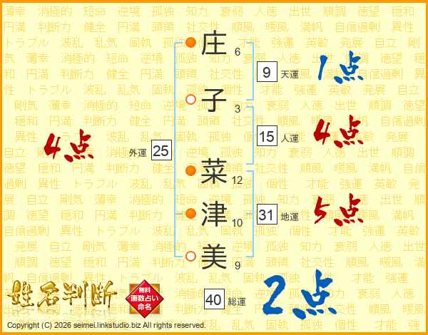 生活面を象徴する運勢です。外部から受ける影響力を表し、結婚運、家庭運や職場、環境への順応性を表します。総運から人運を引いた画数。姓や名が1文字の場合を除く。