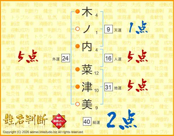 木(4画)ノ(1画)内(4画) 菜(12画)津(10画)美(9画)